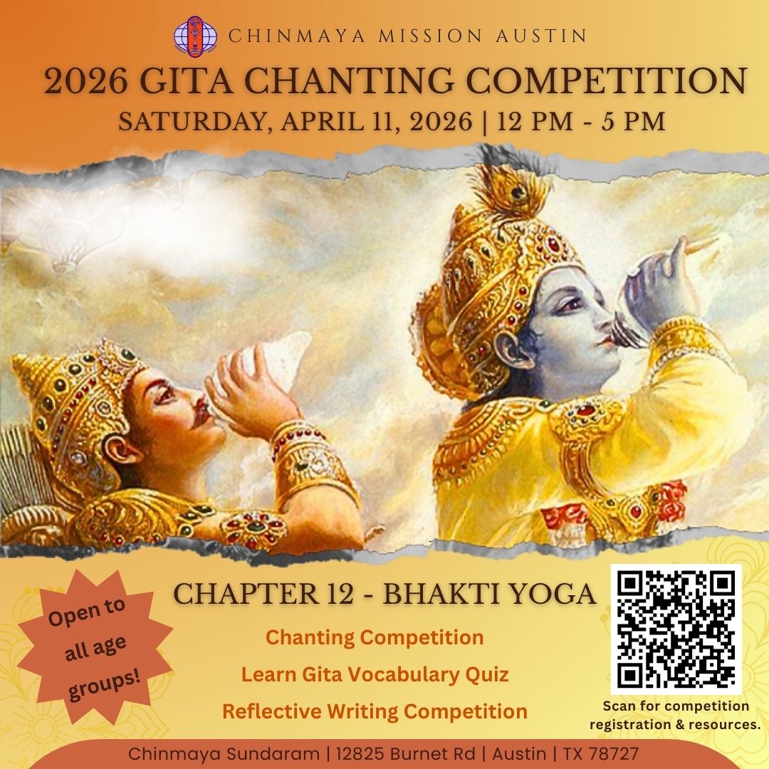 Chant, Learn & Live Gita is the powerful instruction given by our Pujya Gurudev, Swami Chinamayananda in order to enable us to live a noble and inspired life. Bhagavad Gita chanting and the associated competitions are vehicles for inspiring and motivating children and adults to learn and memorize the sacred verses of Srimad Bhagavad Gita.