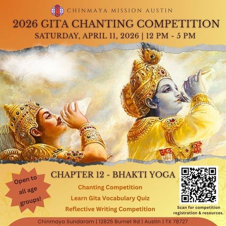 This year, Chapter XII: Bhakti Yoga – The Yoga of Devotion, has been selected for all of us to learn to chant. Competition details, including competition categories, age groups and verse assignments can be found on the CMA Gita Chanting webpage: https://chinmayaaustin.org/gcc_comp-signup.html